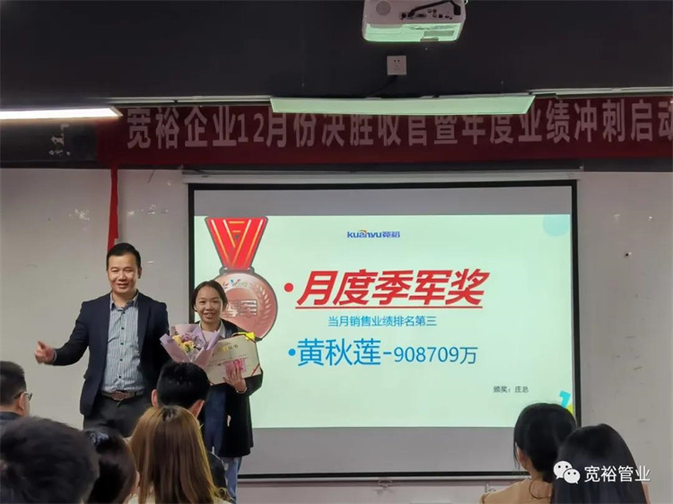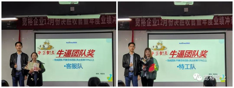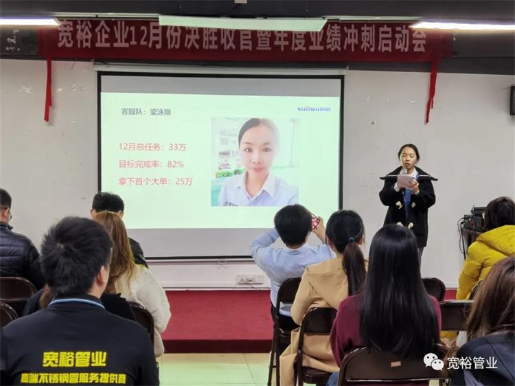 动感满满的舞蹈之后正式开启对12月1-13日的销售业绩回顾,并对个人销量前十、团队业绩完成情况、团队PK情况等进行了总结。在过去的13天里,已经涌现出了多位优秀的将士,他们分别是以100%业绩率先冲刺的00后新生代“小庄”,还有首个拿下本月25万大单的小斯---从跟单员通过不断的努力成为优秀的销售工程师。更有通过前期不断积累了成功开拓经验的来自无敌队的小黄,12月至今已经开发了6个新客户,现场更是迎来了“哇塞”的喝彩声一片!在此小编也仅代表宽裕管业对各位优秀战士的优异成绩表示大写的点赞!你们是最棒的!
