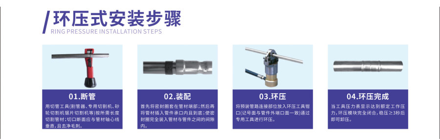 安装时先将宽带密封圈套在管材端部插入管件的承口通过专用工具挤压管件的密封段使其端部下凹嵌入管材,如同丝扣相互咬合强力锁紧;挤压过程中密封腔里的橡胶材料会因承受压力而蠕动直至填满整个腔体进而实现可靠密封。