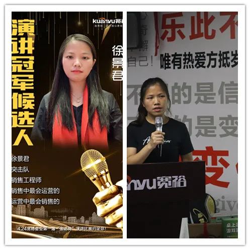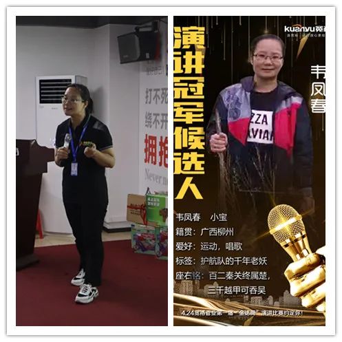 ▶ 来自护航队的韦姐,自称“千年老妖”,是仓储部的主管,为人热心,工作负责,带领全体仓储部同事兢兢业业为销售伙伴提供优质的后勤保障服务。忙碌的仓储工作让韦姐未能参加前期的培训,但她利用晚上的时间自己制作ppt,在比赛前半天闭关演练。“苦心人,天不负!” 韦姐的苦练换来了演讲当天的出色表现!其流畅自如,气势如虹,支持者众!