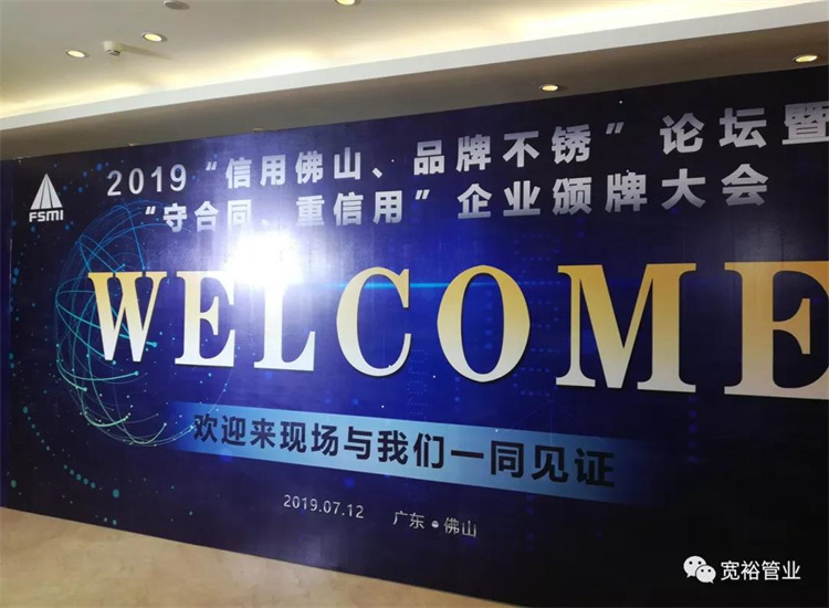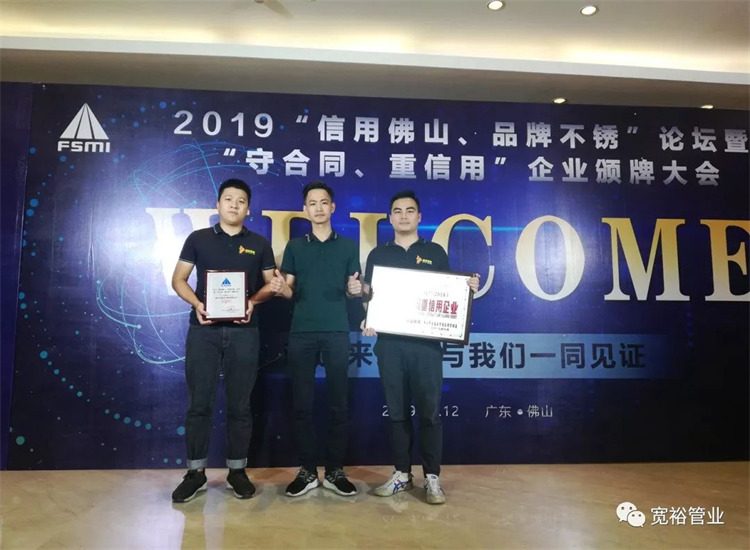佛山宽裕管业被授予“守合同、重信用”企业,佛山市金属材料行业协会执行会长李强先生亲自颁奖。